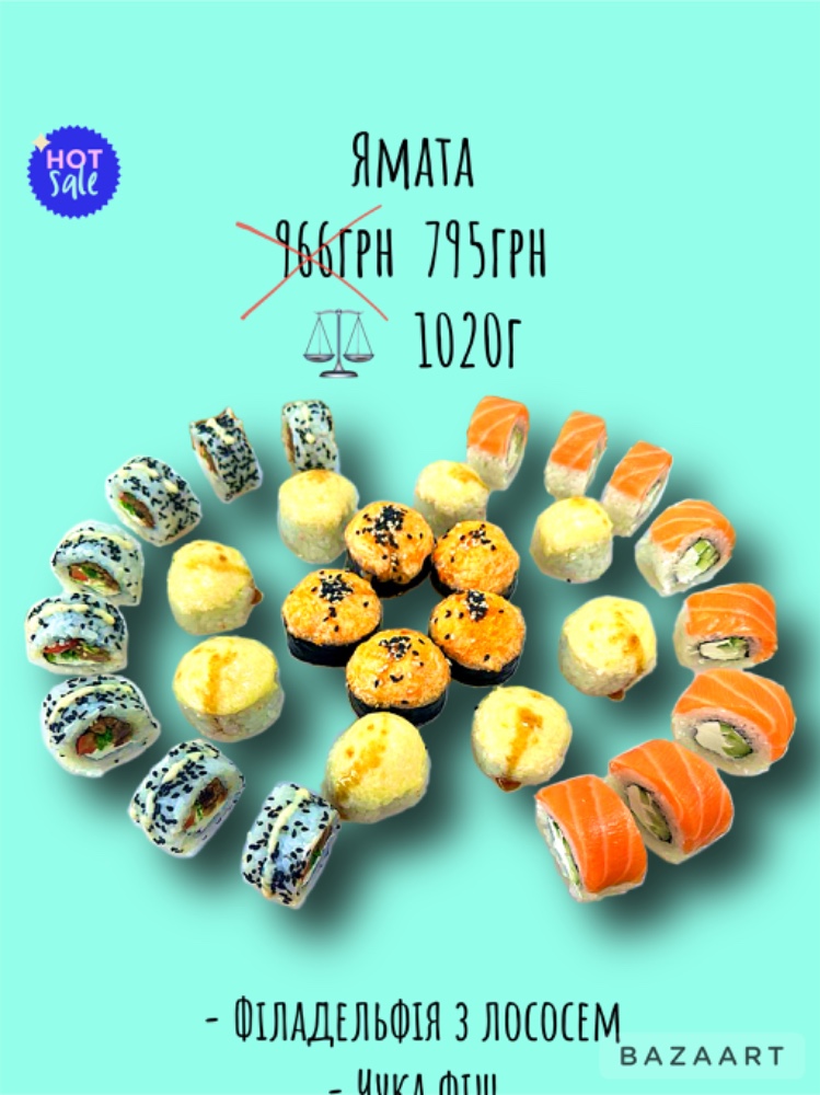 1020гФіладельфія з лососем, Чука фіш, Вулкан з лососем теріякі, Жульєн сан